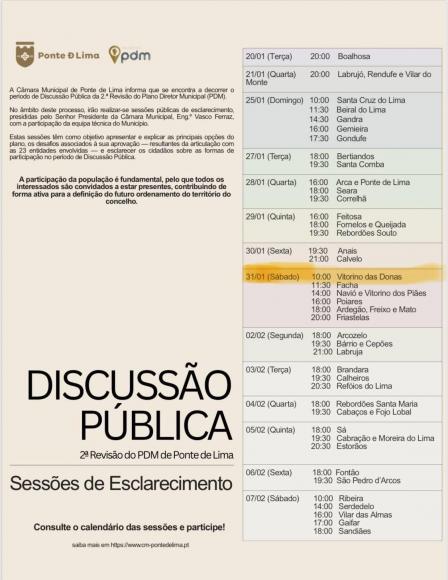 No próximo 31 de janeiro, às 10h00, realiza-se em Vitorino das Donas uma sessão pública de esclarecimento no âmbito da 2.ª Revisão do Plano Diretor Municipal (PDM) de Ponte de Lima, presidida pelo Senhor Presidente da Câmara Municipal de Ponte de Lima.